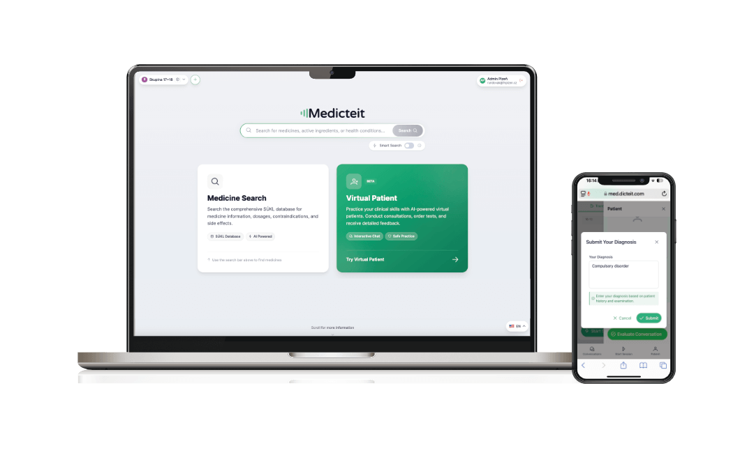 Medicteit is a virtual patient platform powered by large language models and real clinical data. It helps future doctors master diagnostic thinking, interviewing skills, and clinical reasoning — especially in complex cases. Unlike scripted simulators, our AI patients feel real: they talk, hesitate, change their minds, and react based on your questions.